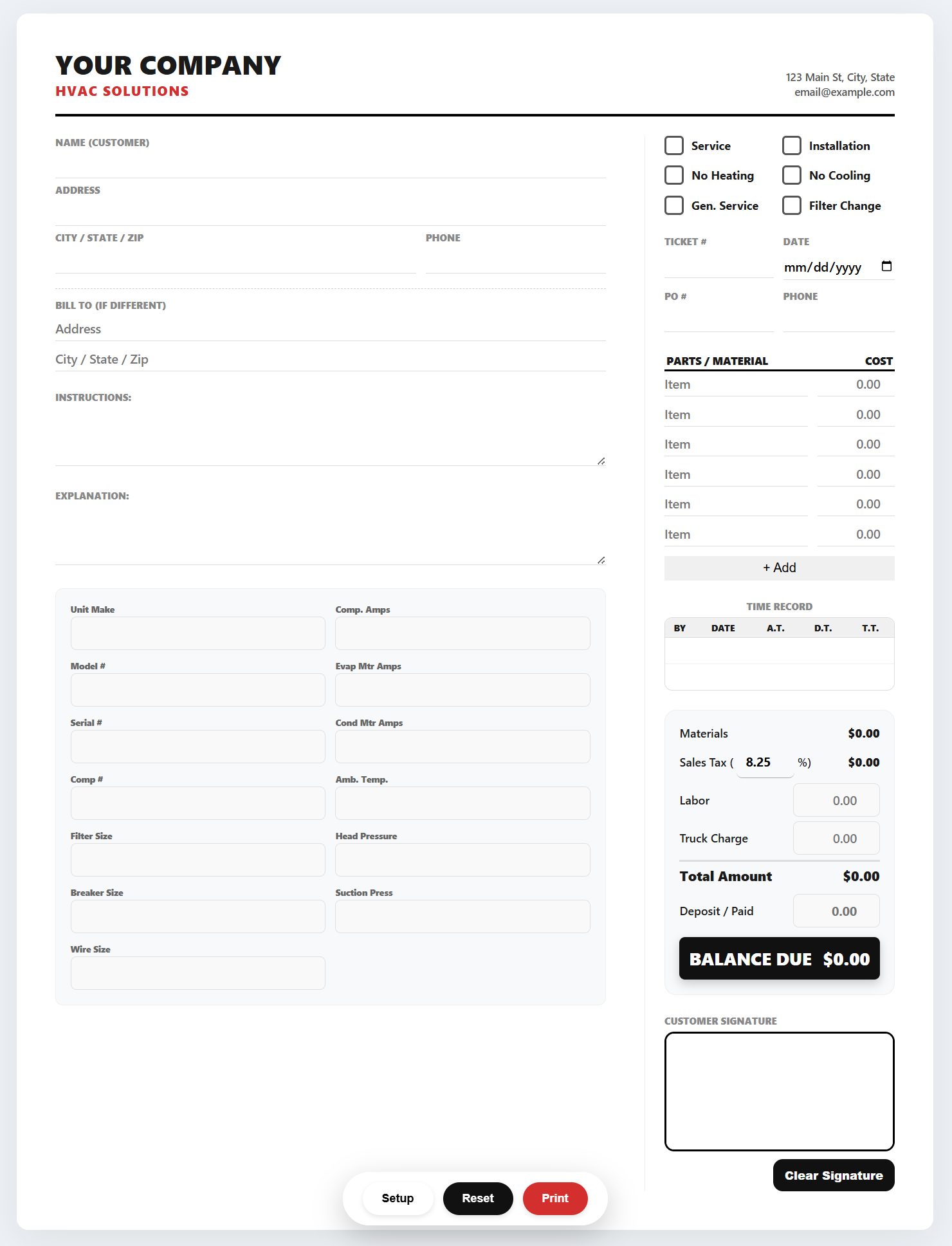 A contractor-grade HVAC estimating application. Handles pricing logic, deposits, balances, signatures, customer details, and print-ready estimates. Designed for sales calls and onsite quoting without internet access.