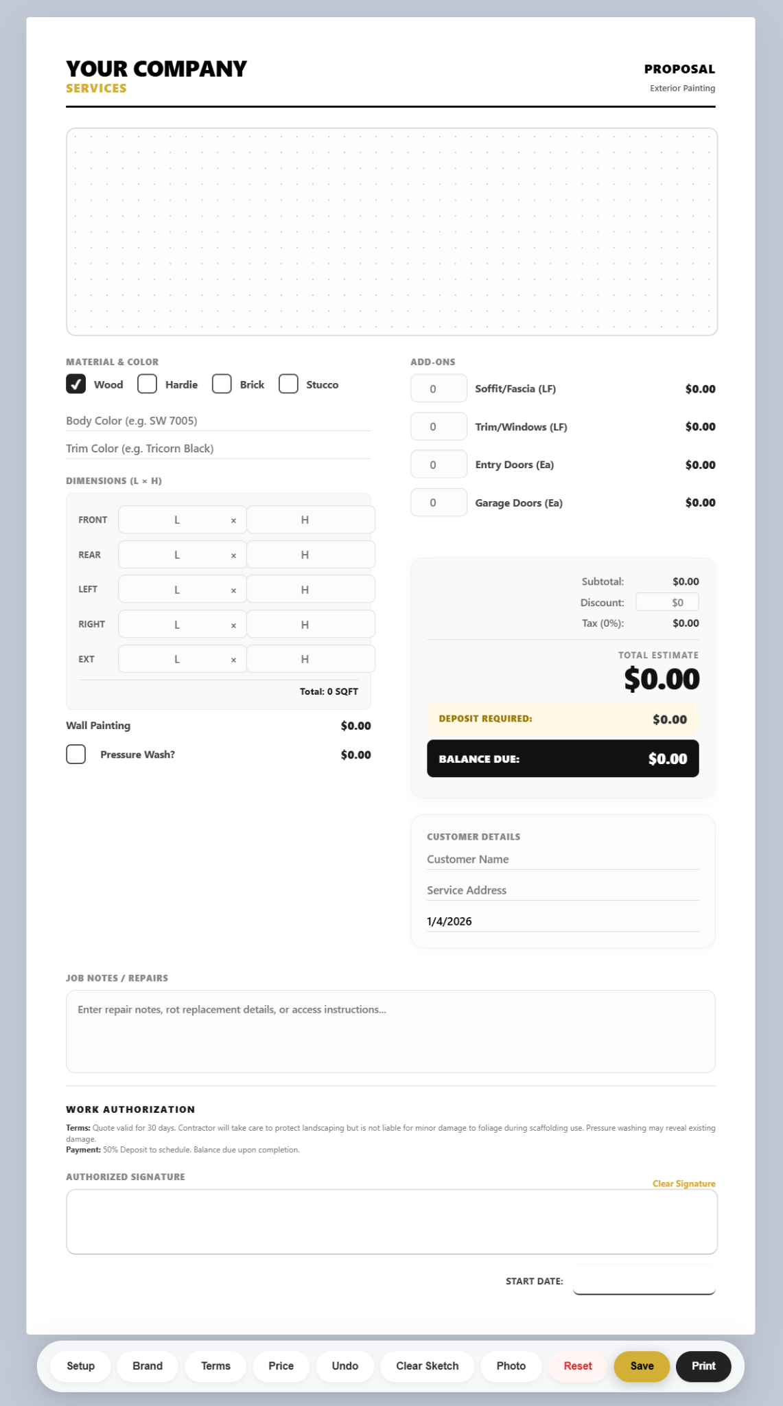 A painting estimator app designed for fast, accurate quoting. Includes editable pricing logic, deposit calculations, signature capture, job notes, and print-ready estimates. Works entirely offline.